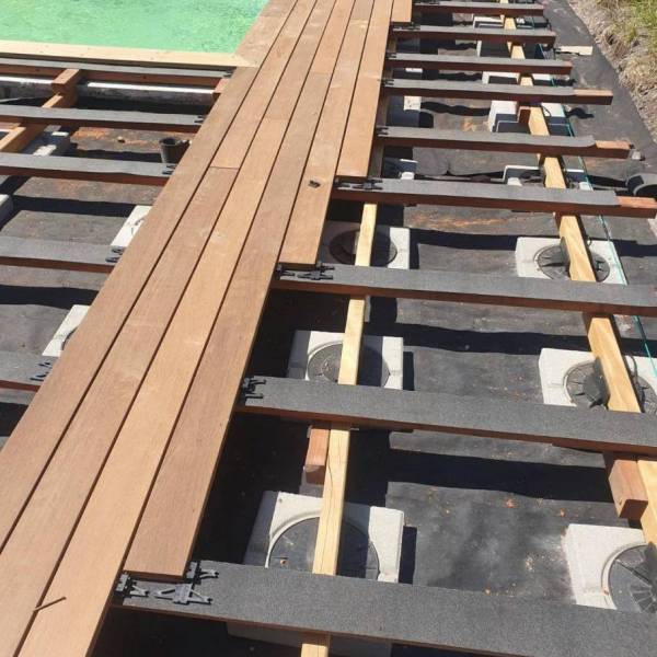 Pour la pose de vos lames, l’utilisation de lambourdes exotiques est recommandée posée avec un entraxe de 500mm (elles offriront une durabilité équivalente à celle de vos lames). Pour une meilleure étanchéité et longévité de votre structure, l’usage de bandes bitumineuse EPDM est également conseillé.